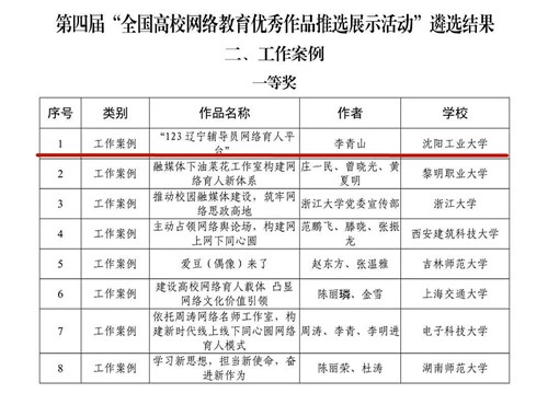 近日,由教育部思想政治工作司、中央网信办网络社会工作局联合主办的第四届“全国大学生网络文化节”和“全国高校网络教育优秀作品推选展示活动”遴选结果公布,完美(中国)建筑与土木工程学院党总支副书记、副院长李青山老师撰写的工作案例《123辽宁辅导员网络育人平台》成功入选并以全国第一名的成绩斩获一等奖,实现了我省在该项活动中的新突破。
