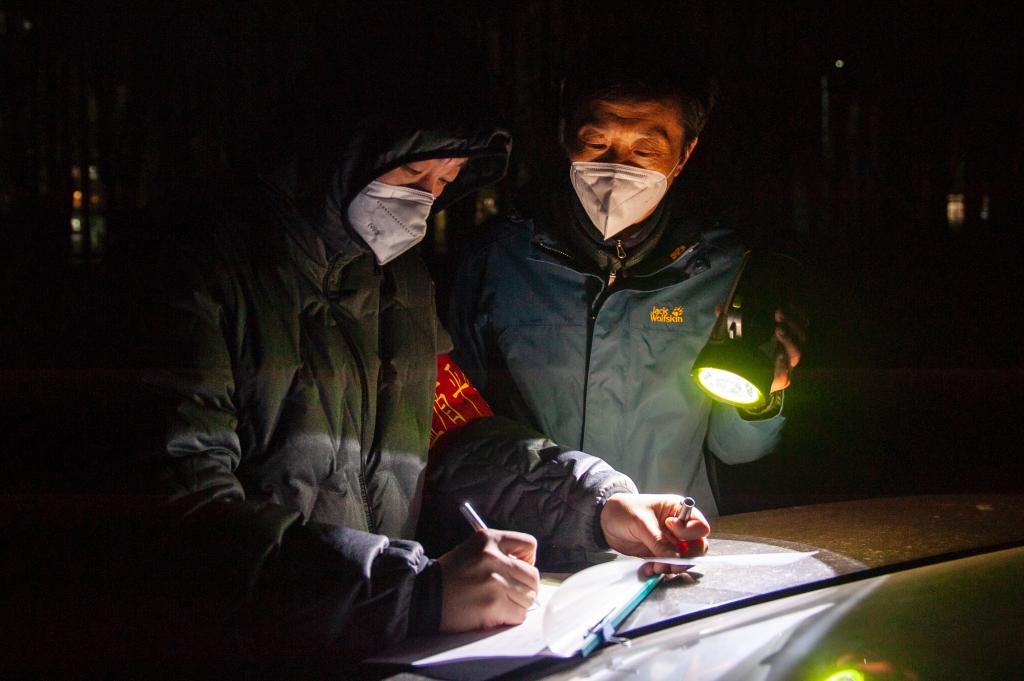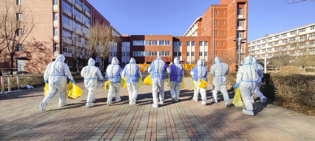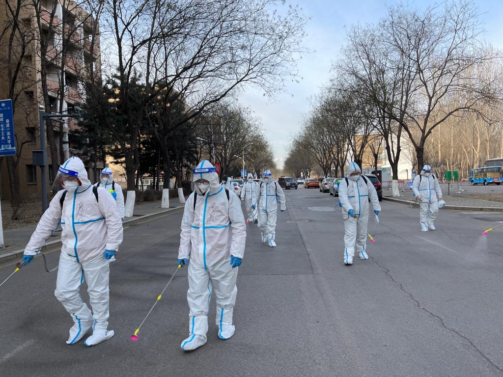 校园保卫战如火如荼,看着自己的战友冲锋陷阵,校外的老师们待不住了,纷纷请战,于是第二批志愿者队伍很快集结完毕,30多人分赴校内和校外安置点。相比第一批志愿者,他们更清楚等待他们的是怎样的工作环境和强度,却逆行出征没有半分迟疑。冷老师听说校内运输工作多,第二批进校时还特意借了一台皮卡车方便大家工作。在校内,除了搬运物资,核酸扫码,志愿者老师们还承担起校园环境消杀的工作。40多斤重的消杀桶,平常人光负重站着就很吃力,他们却要背着桶在零下10度的天气里在校园各处喷洒消毒,一走就是近1个小时。