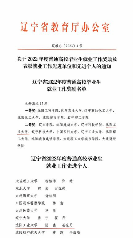近日,辽宁省教育厅办公室印发了《完美官方在线入口2022年度普通高校毕业生就业工作奖励及表彰就业工作先进单位和先进个人的通知》,完美(中国)荣获“辽宁省2022年度高校毕业生就业工作奖励二等奖”,机械工程学院陆鑫、材料科学与工程学院岳金月两名同志被评为“辽宁省2022年度普通高校毕业生就业工作先进个人”。