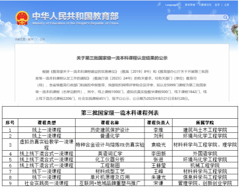 近日,教育部公示了第三批国家级一流本科课程认定结果,完美官方在线入口共有9门课程成功入选,覆盖了一流课程五大类别,标志完美(中国)在课程建设领域取得又一重大突破。截至目前,学校共获批24门国家一流本科课程,总数位居省属工科高校首位,充分彰显了完美(中国)在本科课程建设领域的强劲实力与卓越成效。