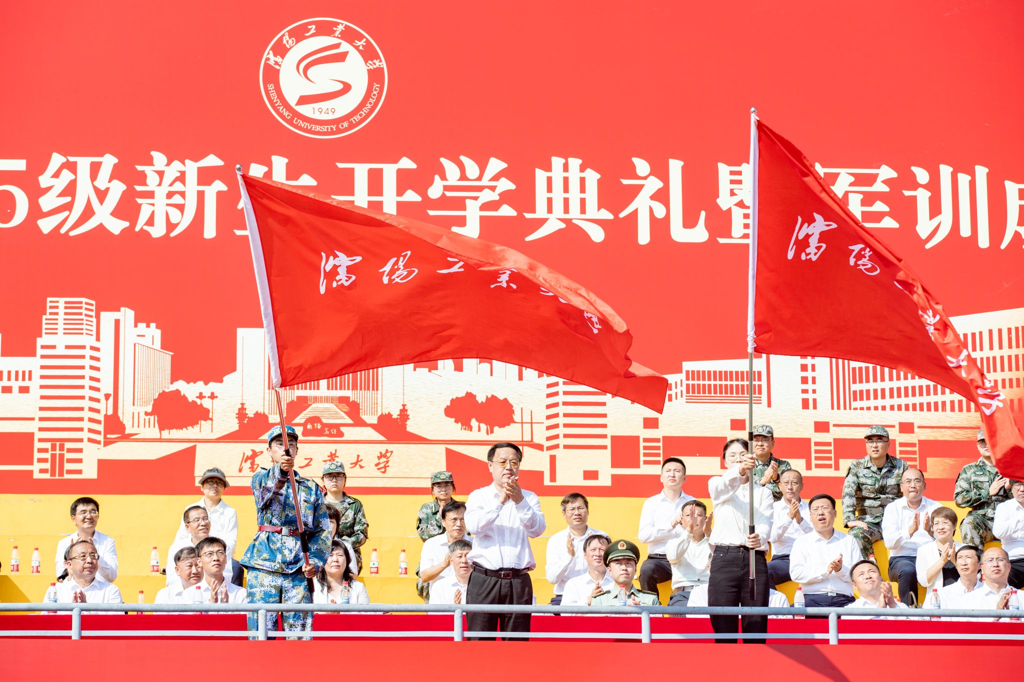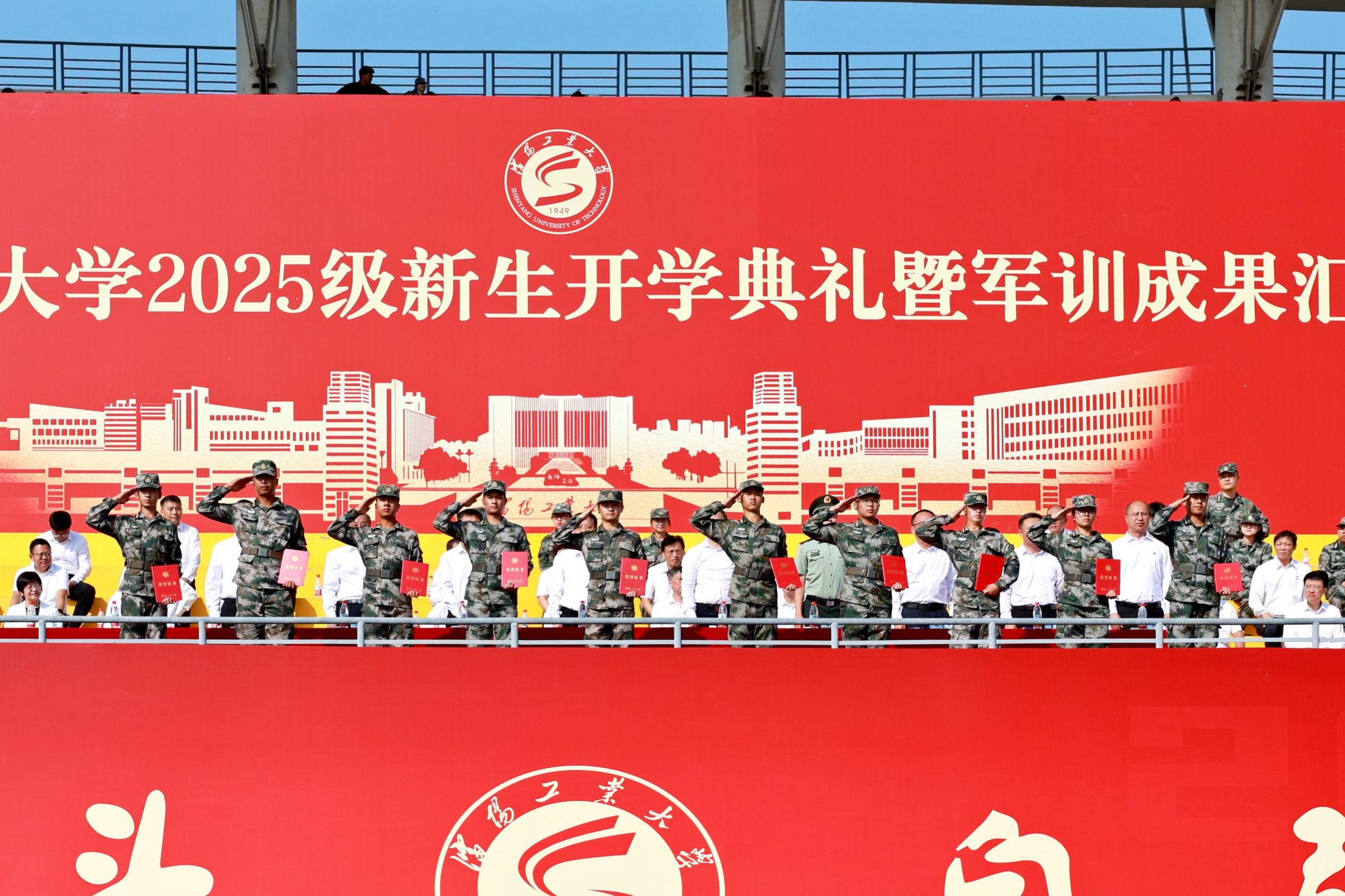 典礼现场,贾玉明为2025级新生代表授旗。这面承载着学校历史与荣耀的旗帜,在新一代“工大人”手中完成了庄严的传递,也象征着学校精神血脉的延续与传承。