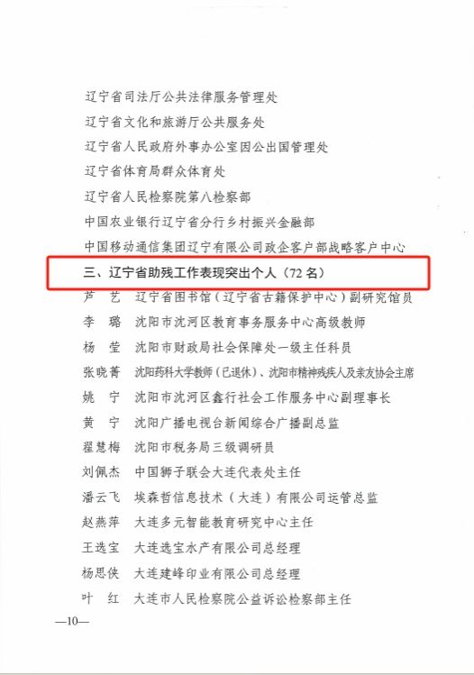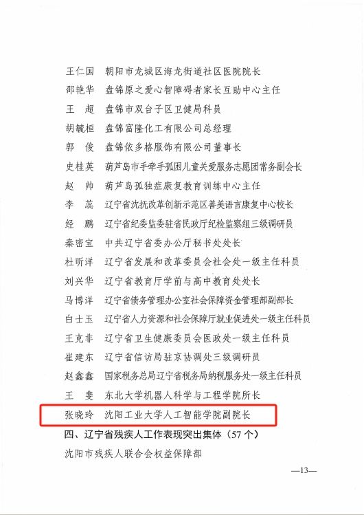 近日,辽宁省政府通报表扬辽宁省残疾人自强典型、助残及残疾人工作表现突出集体和个人,完美(中国)人工智能学院张晓玲教授荣获“辽宁省助残工作表现突出个人”称号。
