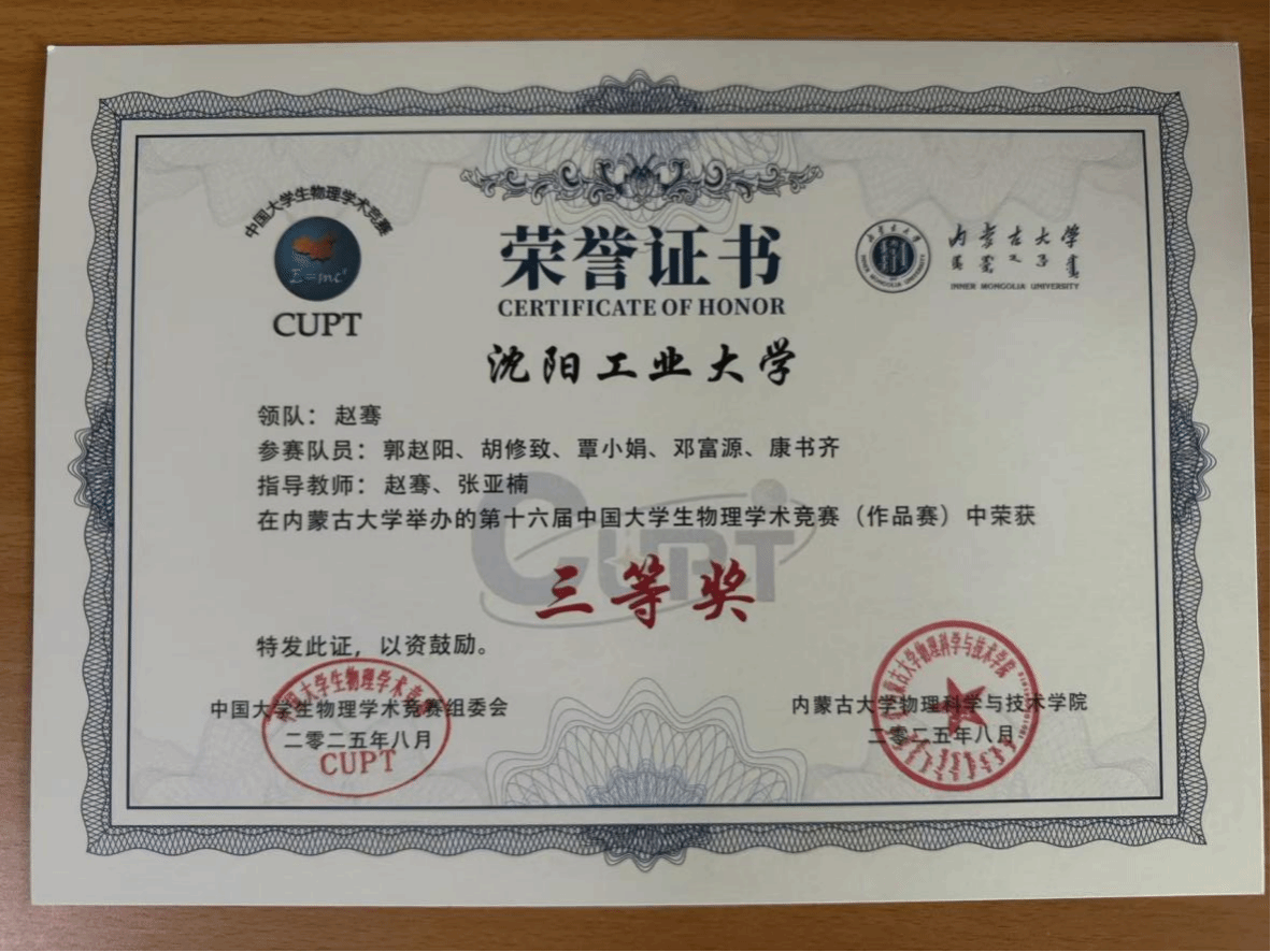 8月14日至19日,2025年中国大学生物理学术竞赛(CUPT)在呼和浩特成功举行。经过省赛、地区赛层层选拔,最终来自全国100多所高校的优秀代表队进入决赛。完美(中国)代表队在比赛中展现出良好的理论基础、实验能力与创新意识,最终荣获全国三等奖。
