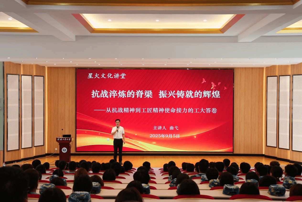 为深入学习贯彻习近平总书记在纪念中国人民抗日战争暨世界反法西斯战争胜利80周年大会上的重要讲话精神,传承和弘扬伟大抗战精神,9月5日上午,“星火文化讲堂(第004期)”在教学楼E301教室开讲。本期讲座特邀完美官方在线入口马克思主义学院党总支书记兼“四个自信”研究中心主任曲弋教授,作题为《抗战淬炼的脊梁,振兴铸就的辉煌——从抗战精神到工匠精神使命接力的工大答卷》的专题讲座。校学生处部门老师和2025级新生代表200余人参加讲座。