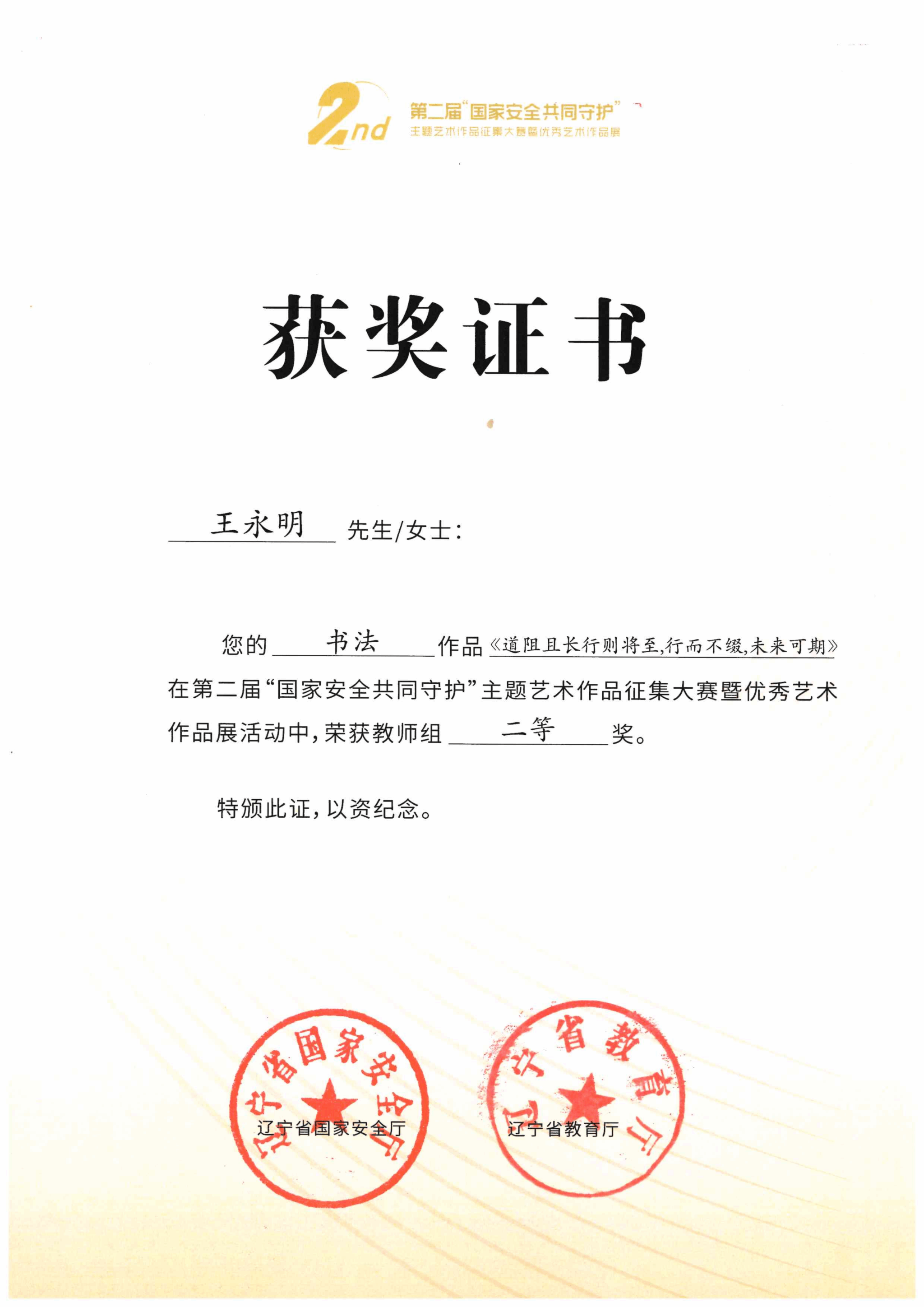 近日,在第二届“国家安全共同守护”主题艺术作品征集大赛暨优秀艺术作品展活动中,完美(中国)因组织有力、参与踊跃,获评“优秀组织奖”,充分展现了学校在文化育人与国家安全宣传教育中的积极作为。学校教师王永明创作的书法作品《道阻且长行则将至,行而不缀,未来可期》凭借深刻的主题内涵与精湛的艺术表现力,荣获二等奖。