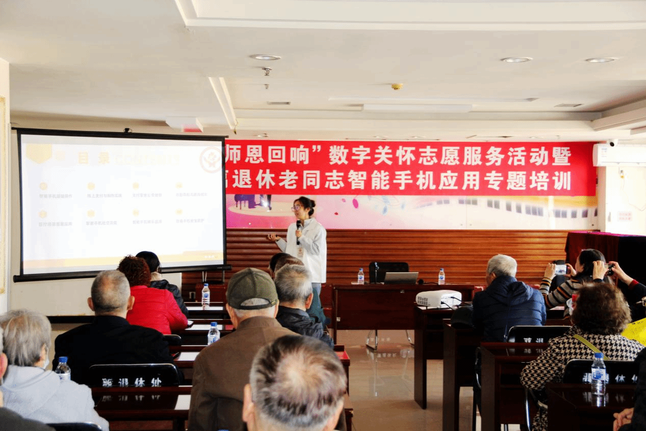 重阳敬老情意浓,师恩回响暖深秋。为切实帮助广大离退休老同志解决日常使用手机时遇到的困惑,掌握智能手机应用技能,共享智能生活。10月22日,由校关工委牵头、材料科学与工程学院和离退休处联合举办的“师恩回响”数字关怀志愿服务活动启动仪式暨首场专题培训在离退休活动中心温馨举行。校关工委、离退休处、材料科学与工程学院相关负责人与众多离退休老教师、志愿者团队齐聚一堂,共同见证了一场以数字技术为桥梁、以感恩传承为内核的温情互动。