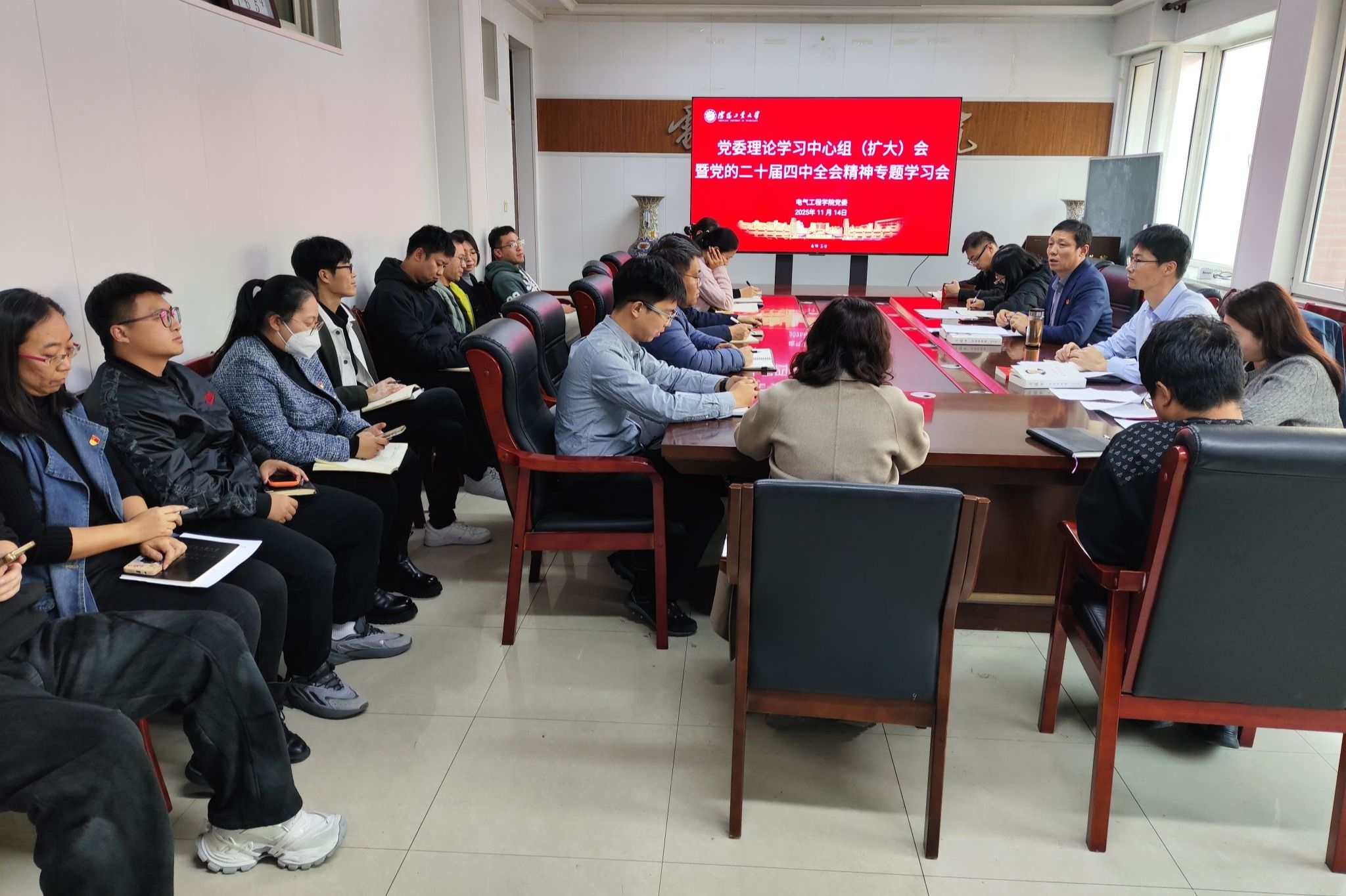 11月14日,电气工程学院党委在320会议室召开理论学习中心组(扩大)会,专题学习党的二十届四中全会精神。党委书记兼副院长韩永强主持会议并讲话,学院党委理论学习中心组成员参加学习,学院各支部书记、系(教研室、中心)负责人、教师“领航工作站”成员和专职组织员列席会议。