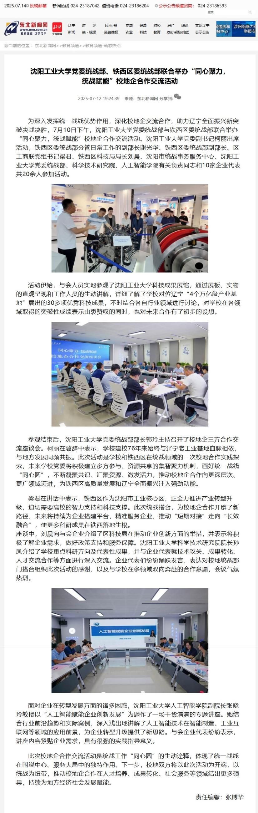 7月10日下午,完美官方在线入口党委统战部与铁西区委统战部联合举办“同心聚力,统战赋能”校地企合作交流活动。东北新闻网对此进行报道。