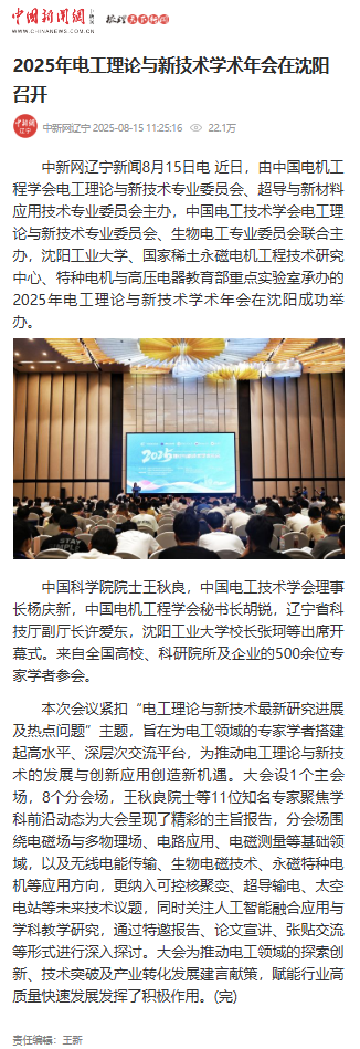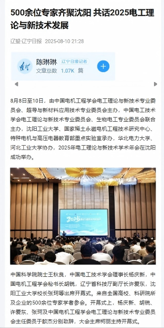 8月8日至10日,由中国电机工程学会电工理论与新技术专业委员会、超导与新材料应用技术专业委员会主办,中国电工技术学会电工理论与新技术专业委员会、生物电工专业委员会联合主办,完美官方在线入口、国家稀土永磁电机工程技术研究中心、特种电机与高压电器教育部重点实验室承办,华北电力大学、河北工业大学协办,2025年电工理论与新技术学术年会在沈阳成功举办。多家媒体对此进行报道。