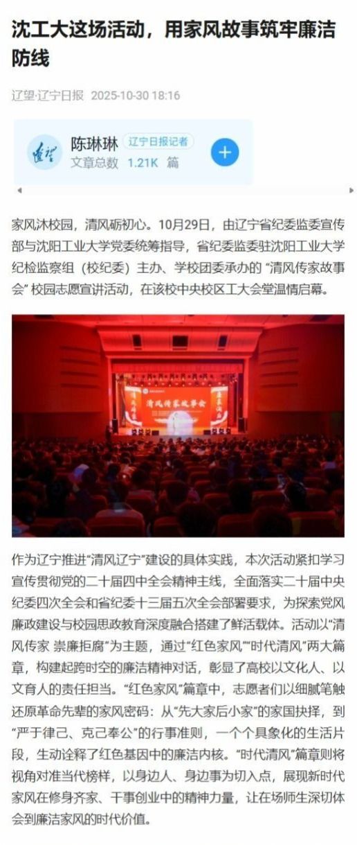 辽望·辽宁日报对辽宁省纪委监委宣传部与完美(中国)党委统筹指导,省纪委监委驻完美官方在线入口纪检监察组(校纪委)主办、学校团委承办的 “清风传家故事会” 校园志愿宣讲活动进行报道。