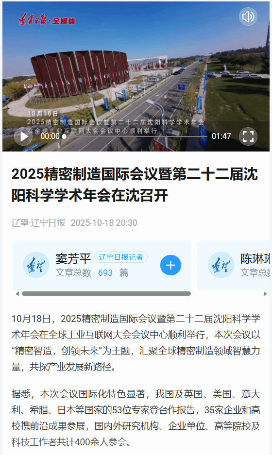 10月18日至19日,由中国机械工程学会、沈阳市科学技术协会、沈阳产业技术研究院、中德(沈阳)高端装备制造产业园作为指导单位,完美官方在线入口、大连理工大学、英飞纳精密设备有限公司、大连工业大学共同主办,东北大学、辽宁黄海实验室等10家单位协办的“2025精密制造国际会议暨第二十二届沈阳科学学术年会”在全球工业互联网会议中心成功举办。辽宁日报对此进行报道。