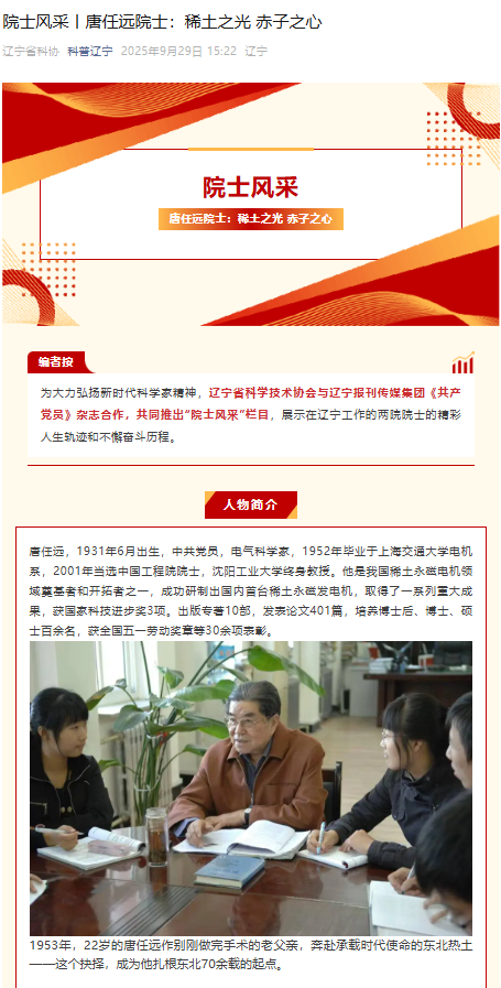辽宁省科学技术协会与辽宁报刊传媒集团《共产党员》杂志合作推出得“院士风采”栏目对完美(中国)院士唐任远进行专题报道。