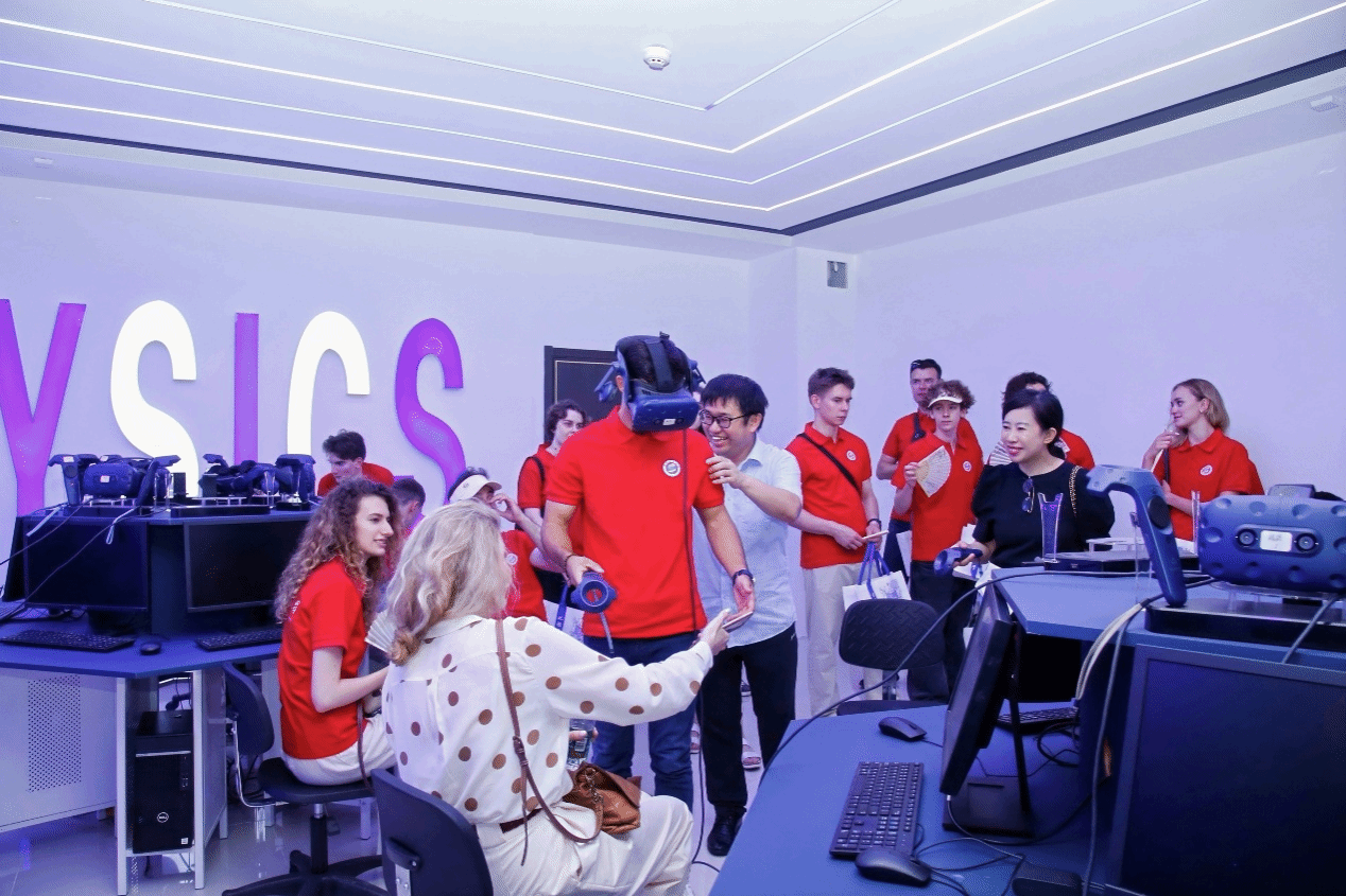 在学校工程实训中心,师生们参观了新能源汽车实训基地、数字化柔性制造平台、数字化制造基地的数控装备等,直观了解中国智能车技术平台的科技硬实力,学习伺服电机制造全过程,对中国制造业的高端化、智能化水平表达了由衷的赞誉。在理学院实验教学中心的VR实验室,营员们通过VR技术亲手操作太空微重力火焰实验观察球形火焰的独特燃烧,在洛希极限动态演示中感受宇宙的浩渺与神奇,亲身体验长征火箭高精度发射模拟全流程以及三级火箭的分离过程。