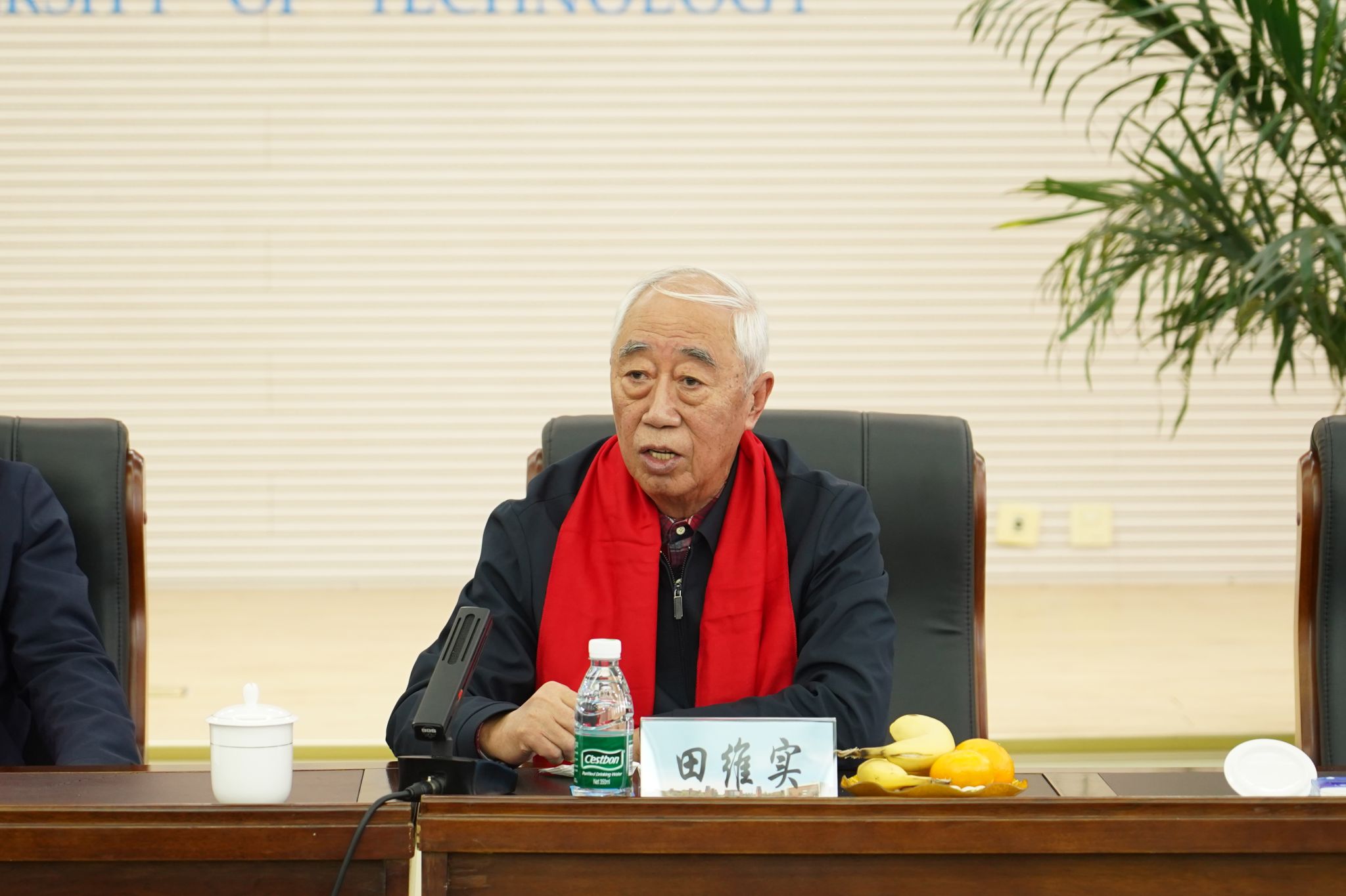 学校原党委书记田维实代表老同志发言,他高度肯定了学校党委带领全校师生在推动改革发展中取得的突出成就,感谢学校党委长期以来对离退休老同志们的关心关爱。他表示,学校对老同志的服务保障工作细致周到,全体老同志都深切感受到组织的关怀与温暖,大家将继续发挥自身优势,为学校各项事业高质量发展贡献智慧和力量。